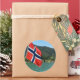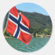 Round photo sticker with the Norwegian flag on a car ferry between Solvorn and Urnes on a fjord in Norway.