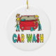Car Washing design shows car cleaning by two expert car washers. One uses a pressure hose to clean away grime and the other uses old-fashioned sponge, soapy water and hard work.