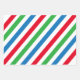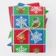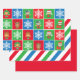 Mignons personnages de Noël enveloppant des feuilles de papier en rouge, vert et bleu. 1ère feuille avec les caractères de Noël, 2ème feuille avec les mêmes rayures rouge, bleu et vert, 3ème feuille rouge. Les trois feuilles d'enveloppement de Noël se complètent avec les mêmes couleurs assorties.