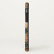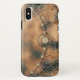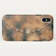 The original collage artwork by ZoeSPEAK on this iPhone X case is reminiscent of tortoise shell and leather, in shades of brown from caramel cream to dark chocolate. The case is designed in the style of a clutch bag or purse, with a top flap of smooth shapes looking almost like clouds. Its curved edge is highlighted by gold beads and a thin golden border. The pattern continues over the rest of the case, but with a texture of lines like crackled glass over the cloud shapes. There is a flap closure in the centre, a round disc made of the crackled ice pattern, with a thin golden border. Over this there is a gold sphere with a monogram in black. This is set to personalize, or delete if you wish.
