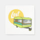 A doted style illustration of a caravan, inspired by sixties and seventies comics and print advertising. A tranquil scene showing a caravan with retro colours (yellow, brown, green). The caravan is framed by the sun with the word lost written on it in brush stokes.