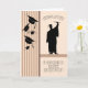 Card for a degree in business administration. The design is in the colours of the degree, with a row of stripes in medium brown and tan, with a silhouette of a male graduate on the right side of the card. The left side has graduation caps in a falling position. Perfect design for the purpose. Thanks to Coffee Shop Blog and the Hungryjpeg for some of the elements in the design.