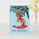 Photo image of wooden rocking horse, with red mane and rockers, sitting under branches of tree. "Ride 'Em Cowboy" on front, and "Happy Birthday" inside may be changed.