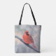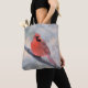 Lively Northern Cardinal likes to pose by the creek! Cheery printed tote bag, ideal gift idea for bird watchers or lovers of nature!