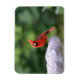This flexible magnet features a red male cardinal sitting on the edge of a birdbath in New England