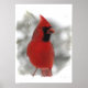 This poster features a brilliant red cardinal. He is truly the king of backyard birds! Here he is perched on a snowy rail eating black oil sunflower seeds while the winter snow swirls around him.