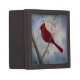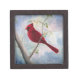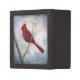 From an original mixed media painting by Brenda Thour of a red male cardinal sitting on a bare tree branch with an abstract blue and pink sky. Copyright by Brenda Thour 2005.