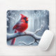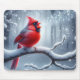A red cardinal bird singing on a winter tree branch singing with musical notes