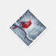 A red cardinal bird singing on a winter tree branch singing with musical notes