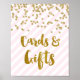 Cards and gifts wedding sign poster in light pastel blush pink and white stripes pattern with gold confetti and handwritten style lettering.