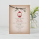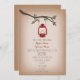 A wedding invitation featuring an illustration of a lantern filled with a red camping lantern hanging from a tree branch with green leaves. Background is cardstock inspired. Personalize the text with details of your occasion.