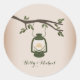 An outdoors wedding sticker with a wilderness / camping theme featuring an illustration of a green camping lantern hanging from a tree branch with green leaves. Personalize the text with your names.
