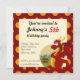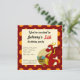 Invitations imprimés d'anniversaire avec l'illustration d'un dragon rouge gardant un trésor. Illustration de Maxi Harmony