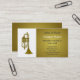 Cartes de visite pour les joueurs de trompette ou les instructeurs; conception de musique dorée et blanche avec illustration d'une trompette; design est personnalisé avec des champs de texte personnalisables pour ajouter vos nom, entreprise, adresse et autres informations