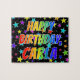 This lively, vibrant, birthday-themed jigsaw puzzle design features the message "HAPPY BIRTHDAY, CARLA" with the characters having a colourful rainbow spectrum inspired gradient pattern, along with a fun stars background pattern. A vibrant puzzle like this might be used to send birthday greetings to somebody named Carla. [~Z0000468]