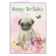 Un adorable petit chiot en carlin est la caractéristique sur le devant de cette mignonne carte d'anniversaire. Le chiot est assis devant un bouquet de lavande et de rose floral aquarelle, et un petit poussin jaune est à ses côtés. Quelques papillons de printemps complètent l'image. Le texte vert en haut indique "Joyeux anniversaire". Le texte est facilement modifié, tout comme le message intérieur.