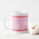 Striking orange and pink, carnation, stripes and beads first wedding anniversary mug. The example reads First Anniversary - Jessica & Geoff. These words can be changed to your own special words and couples names. A perfect gift for a first wedding anniversary couple as carnations are the flower for one year of marriage. Uniquely designed by Sarah Trett for www.mylittleeden.com