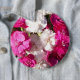 A pretty button with a posy of pink and white border carnations, part of a photograph by Judy Adamson.