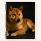 This lined hardcover spiral notebook features a calm Shiba Inu portrait on a deep black background.