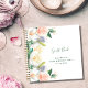 Un livre d'or ou un organisateur de fête pour une fête du 100e anniversaire. Décoré de grandes fleurs d'été aux couleurs d'eau luxuriantes, fleurit des roses et des pivoines en or blanc, corail et rose. Arrière - plan blanc chic. Le titre : Guest Book est écrit avec un script de style moderne écrit à la main.