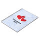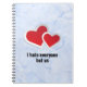 Un drôle de carnet en spirale avec une illustration de la Saint Valentin de 2 coeurs de papier rouge et un texte typographique qui dit : Je déteste tout le monde sauf nous. Placé sur un arrière - plan en marbre bleu glacé.