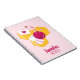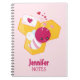 Carnet spiral à l'image douce d'une abeille rayée rose et blanche. Un morceau de nid d'abeille jaune derrière. Une lettre scellée avec un coeur et un groupe de coeurs flottants font également partie du design. Personnalisez avec un nom et un titre.