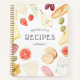 La conception de carnet de recettes mignonnes comprend trois lignes de texte personnalisé en lettres modernes, entourées d'illustrations de fromages, viandes, pain et fruits. Personnalisez la colonne vertébrale avec du texte personnalisé supplémentaire.