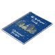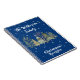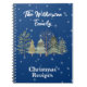 Ce cahier personnalisé présente un design hivernal cosy sur un fond bleu avec de la neige qui tombe. Une image de style aquarelle de divers arbres dans une petite forêt hivernale est imprimée au centre. Un nom de famille exemple est imprimé en haut dans une police de caractères élégante que vous pouvez personnaliser pour inclure votre propre nom ou texte. Un titre exemple "Recettes de Noël" est imprimé en bas.