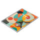 Une peinture moderne du milieu du siècle aux formes géométriques variées en rouge, turquoise, orange, noir et vert avec un nom blanc ou monogramme gras avec 2 lignes de texte supplémentaires