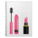 Belle illustration d'un rouge à lèvres rose et d'un maquillage en mascara sur une couleur arrière - plan blanche avec un joli motif damassé gris clair.