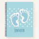 Carnet en spirale avec une charmante image des empreintes de bébé bleu avec un contour blanc épais. Pois blancs sur un arrière - plan bleu bébé derrière l'illustration. Personnalisez avec un nom.