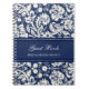 Carnet en spirale de livre d'invité de mariage dans le bleu marine foncé et crème outre du motif floral classique blanc de damassé, avec le texte personnalisable pour ajouter votre propres nom et date de mariage.