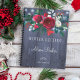 Élégant carnet de recettes hivernales avec de beaux bouquets de pivoines rouges bordeaux et blancs avec branches de sapin vert de pin saisonnier, baies rouges et feuillage sur un bois de grange bleu marine foncé comme arrière - plan avec lampes à cordes. ++++++++++++++++++++++++ Ce livre de recettes peut être un beau livre de recettes pour votre famille ou un cadeau personnalisé pour quelqu'un de spécial, anniversaire, anniversaire, Noël, douche nuptiale ou cadeau mariage.