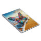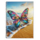 The image features a spiral notebook adorned with a beautiful butterfly design against the backdrop of a beach. This scene combines elements of nature and art, showcasing the intricate details of the butterfly alongside the serene coastal environment.