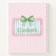 Ce joli cahier présente un cadre rose avec des rayures bleues et blanches et surmonté d'un nœud à carreaux en vichy vert et blanc sur un fond de pois roses et blancs de chaque côté. Personnalisez avec le nom ou le texte de votre choix sur le devant et le dos. Amusant pour les cadeaux de fête personnalisés et les sacs-cadeaux.