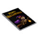 Cast on your notes with this magical tabby witch kitten spiral notebook perfect for journalling schoolwork or jotting down your favourite autumn recipes this notebook features an adorable tabby kitten in a purple which is hat and cape soaring through the night on her broomstick with a glowing lantern set against a deep black background with a bold happy Halloween greeting this high-quality journal combined spooky sweet charm with every day practicality a wonderful gift for a cat lovers writers or students who want to bring a touch of whimsical enchantment to their desk