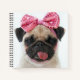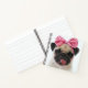 Chien carlin avec langue sortie avec un ruban rose pailleté, arrière - plan blanc.