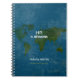 Un carnet bleu moderne à l'école ou au bureau, personnalisé avec votre propre nom (ou entreprise, marque...), initiales et lignes de texte personnalisées (sujet spécial)... et avec une carte verdâtre du monde.