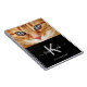 Un arrière - plan noir chic. Personnalisez et ajoutez votre photo, un nom, une lettre monogramme et un texte. Le nom est écrit en blanc avec un grand script de style à la main moderne avec des swashes. La lettre monogramme en gris. Pour que les swashes ne suppriment que le nom de l'échantillon, laissez les espaces ou les émoticônes devant et après le nom