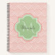 Un carnet de taille standard motif de pétoncle rose clair chic avec un badge vert doux en quatrefoil vous pouvez personnaliser en ajoutant facilement votre propre monogramme et votre nom. Cela fait partie de la collection de printemps du Monogramme vert du Nil des pétoncles Dahlia en fleurs.
