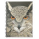 Un crayon de couleur et un dessin au stylo d'une Grande Chouette à la corne avec des yeux orange percés.