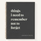 Citation de couverture amusante "choses dont je dois me souvenir de ne pas oublier" simple design minimaliste carnet gris pour les notes, de faire des listes, et plus encore. Des études montrent que écrire des choses les rend réels et envoie un signal à votre cerveau que vous êtes sérieux pour les faire se produire. Une variété de motifs de papier intérieur à choisir. Personnalisez la couverture avec un nom ou une citation spéciale - le livre est à vous. N'hésitez pas à changer d'arrière - plan et de couleur de texte pour correspondre à vos rêves ©Marisu Valencia