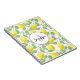 Un carnet en spirale personnalisé avec une initiale monogramme et un nom à l'intérieur d'un cercle blanc avec une bordure en corde noire. Conçu avec des citrons jaunes et des feuilles verts, dans un motif extensible.