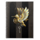 Steampunk, antique, doré, colibri mécanique avec engrenages en laiton et clé en argent sur rayé, arrière - plan brun. Oiseau d'or.