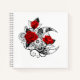 Contour, lune de croissant mécanique avec des engrenages, décoré de roses rouges avec des tiges noires spirées et feuilles sur arrière - plan blanc. Steampunk