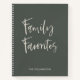 Ce livre de recettes à la mode présente une mise en page minimale avec un arrière - plan moderne vert sauge foncé, un script blanc crème pour "Favoris de famille" et votre nom de famille ou autre texte de choix. Customisez ce journal de recettes pour vous ou offrez-le comme cadeau pour un réchauffement de la maison ou pour les premiers propriétaires.