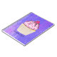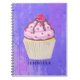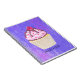 Un carnet en spirale avec l'illustration d'un cupcake délicieux. Le gel rose et les gouttelettes de chocolat. Porte-cupcake jaune et framboise sur le dessus. Yummy ! L'arrière - plan est une texture abstraite violette avec des petits coeurs partout.