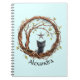 Un mignon chaton noir assis dans une couronne de branches tressées regarde une étoile argentée suspendue à une branche d'arbre.