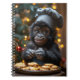 Un petit gorille avec un bonnet de cuisine derrière une table avec une assiette de biscuits et sourit joyeusement dans la caméra.