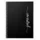 Cahier à spirale de script de signature féminine de monogramme noir moderne et simple. Cette conception minimaliste de couleur simple présentant votre prénom dans une jolie typographie de police à queue de style lettrage à la main blanche sur fond de couleur noire. Facile à personnaliser. Cadeau personnalisé génial pour une fête d'anniversaire, un mariage, une fête d'anniversaire SWEET 16, une douche de mariée, une douche de bébé et pour quiconque aime le style minimaliste joli.